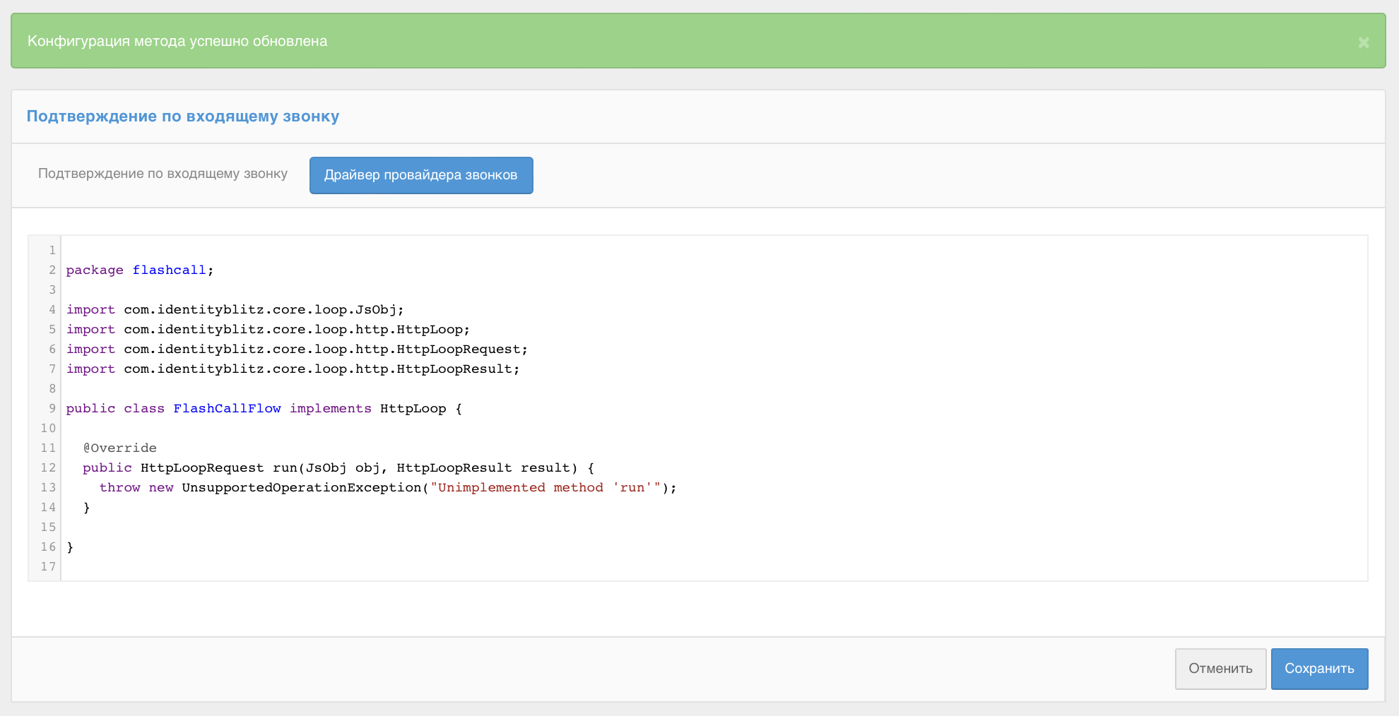 Пример процедуры для интеграции с провайдером Flash Call#package flashcall; import com.identityblitz.core.loop.http.HttpLoop; import com.identityblitz.core.loop.http.HttpLoopRequest; import com.identityblitz.core.loop.http.HttpLoopResult; import com.identityblitz.core.loop.JsObj; import java.util.Collections; public class FlashCallFlow implements HttpLoop { public HttpLoopRequest run(final JsObj obj, final HttpLoopResult result) { if (result == null) { final String number = obj.asString("phone_number"); return HttpLoop.callBuilder("POST", "http://test.flashcall.ru/api/v1") .withHeader("Token", "1234567890") .withBody(JsObj.empty.addString("id", "test").addString("dst_number", number.substring(number.length() - 10))) .build(JsObj.empty); } else if (result.status() == 200) { final JsObj body = result.body(); return HttpLoop.Ok(JsObj.empty.addString("code", body.asString("SenderID"))); } else { return HttpLoop.error("wrong_http_status", Collections.<String, String>singletonMap("status", "" + result.status())); } } }