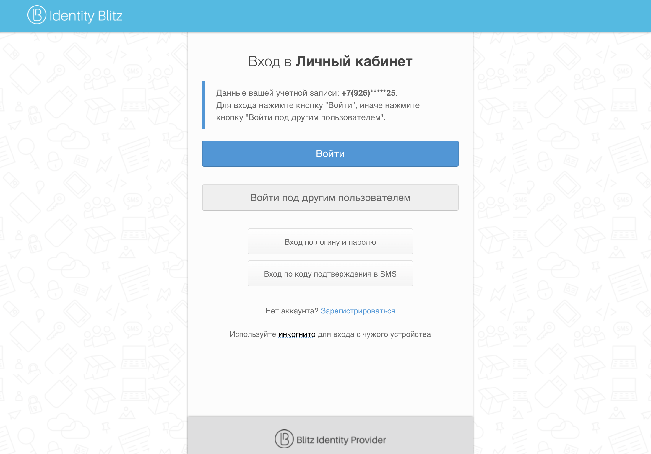 В зависимости от настроек Blitz Identity Provider, установленных организацией, пользователю может быть доступен вход с помощью автоматической идентификации. В этом случае одно или несколько свойств сессии пользователя будут автоматически вычислены Blitz Identity Provider, по ним найдена соответствующая учетная запись и предоставлен доступ в систему. Частным случаем входа с помощью автоматической идентификации является вход по номеру телефона, автоматически определенному по IP-адресу пользователя мобильного интернета.