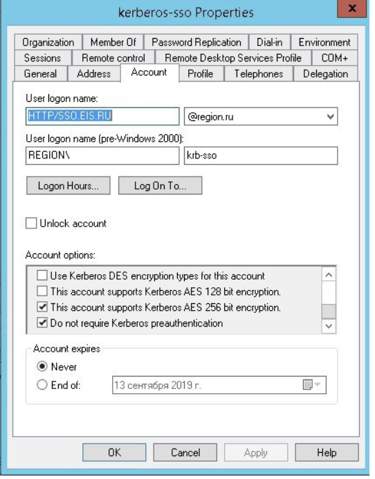 Запрет предварительной аутентификации Do not require Kerberos preauthentication включить только при возникновении проблем со входом по сеансу ОС. В большинстве случаев она не требуется.