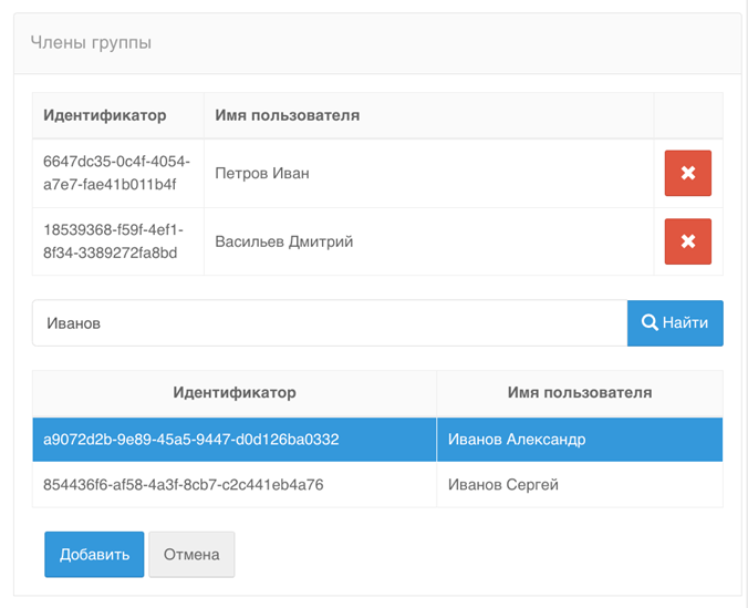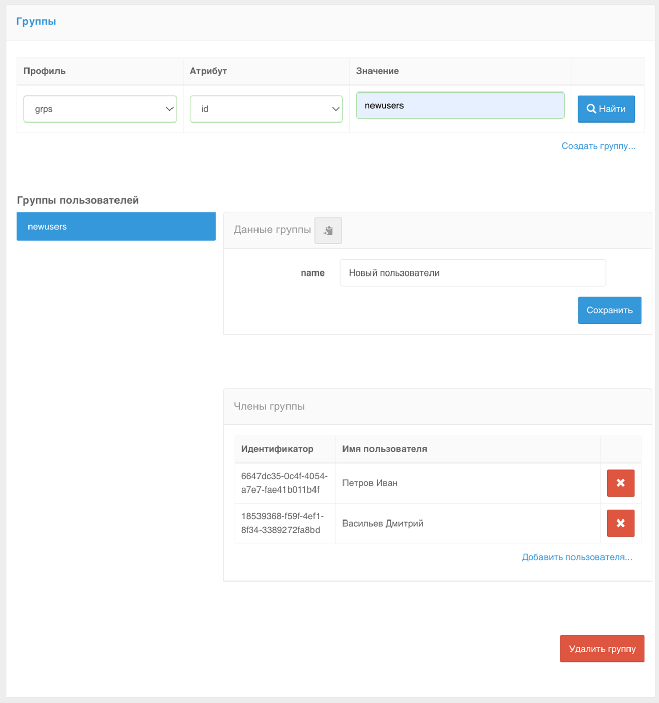В разделе Группы можно осуществлять поиск групп по одному из сконфигурированных атрибутов, редактировать группы, создавать и удалять группы, управлять членством пользователей в группах.