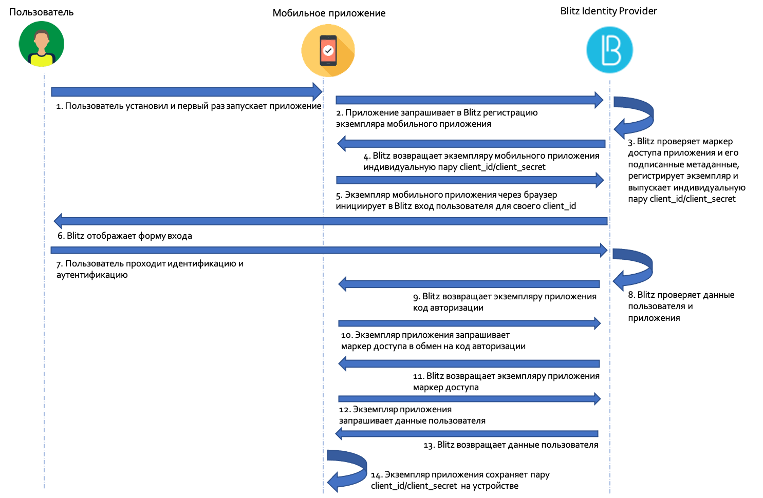 Взаимодействие мобильного приложения с Blitz Identity Provider включает следующие этапы: