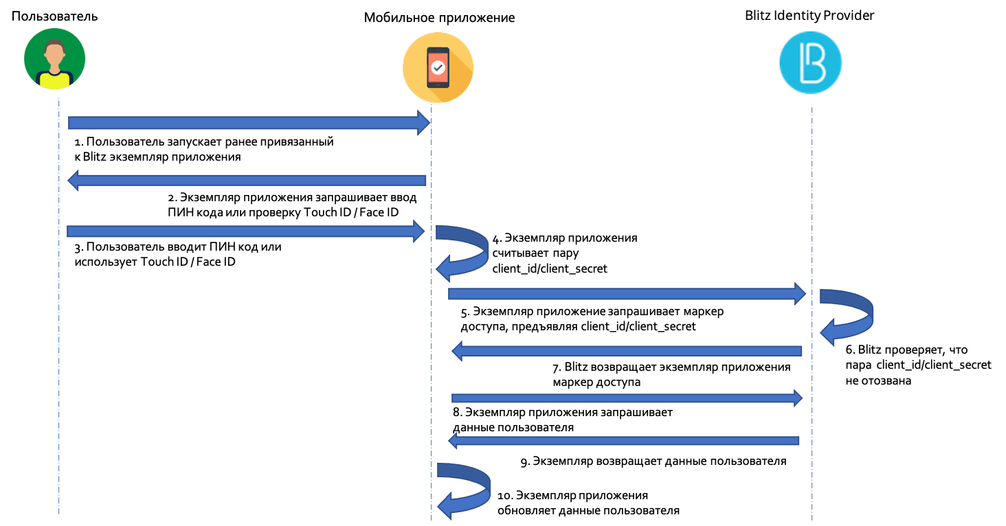 client_id/client_secret.Первичный вход пользователя в мобильное приложение с помощью Blitz Identity Provider. Установка пользователем ПИН-кода или Touch ID/Face ID. Сохранение на устройстве шифрованной пары