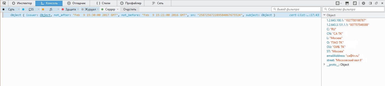 createFactory, предоставленные производителем.Запустите локально данную веб-страницу. В консоли браузера будут видны данные подключенных сертификатов. Например:
