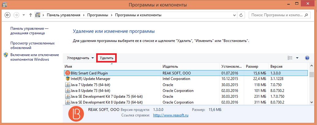 При необходимости удалить плагин в среде Windows перейдите в Панель управления, найдите раздел Установка и удаление программ (или Удаление программы). В появившемся окне выберите приложение Blitz Smart Card Plugin и нажмите на кнопку Удалить: