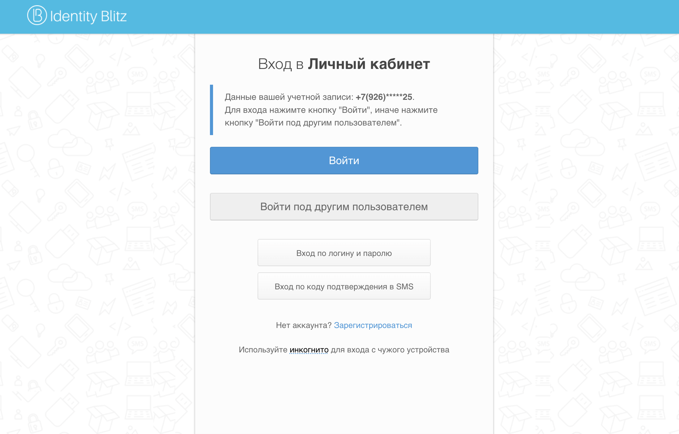 В зависимости от настроек Blitz Identity Provider, установленных организацией, пользователю может быть доступен вход с помощью автоматической идентификации. В этом случае одно или несколько свойств сессии пользователя будут автоматически вычислены Blitz Identity Provider, по ним найдена соответствующая учетная запись и предоставлен доступ в систему. Частным случаем входа с помощью автоматической идентификации является вход по номеру телефона, автоматически определенному по IP-адресу пользователя мобильного интернета.