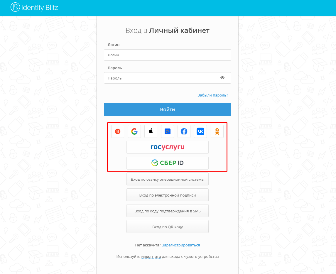 В зависимости от настроек Blitz Identity Provider, установленных организацией, помимо входа по логину и паролю, пользователю может быть доступен вход с использованием внешних сервисов идентификации. Внешний вид страницы входа при включенных внешних сервисах идентификации может отличаться в зависимости от настроек, установленных организацией.