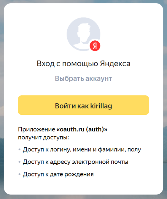 При первом входе через учетную запись пользователя внешний сервис идентификации может дополнительно запросить доступ к данным пользователя.