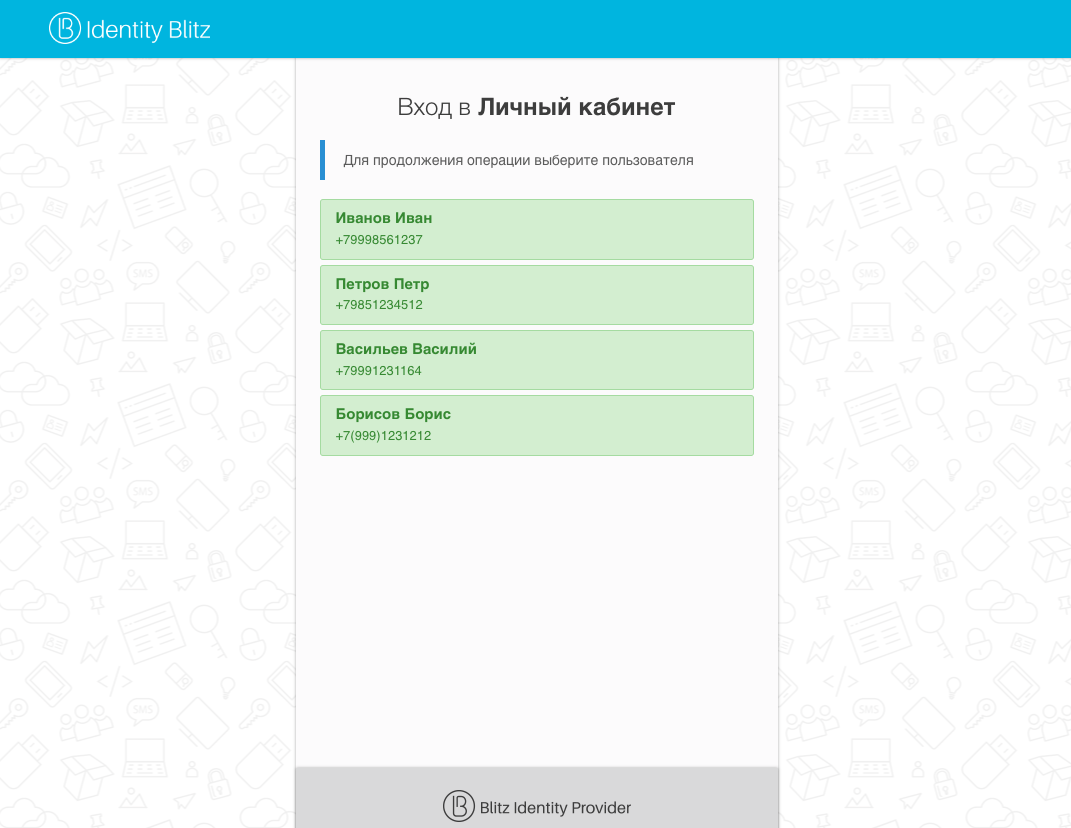 Если пользователь входит с помощью такой учетной записи внешнего сервиса идентификации, которая одновременно привязана к нескольким учетным записям в Blitz Identity Provider, то пользователю будет показан экран выбора учетной записи для входа.