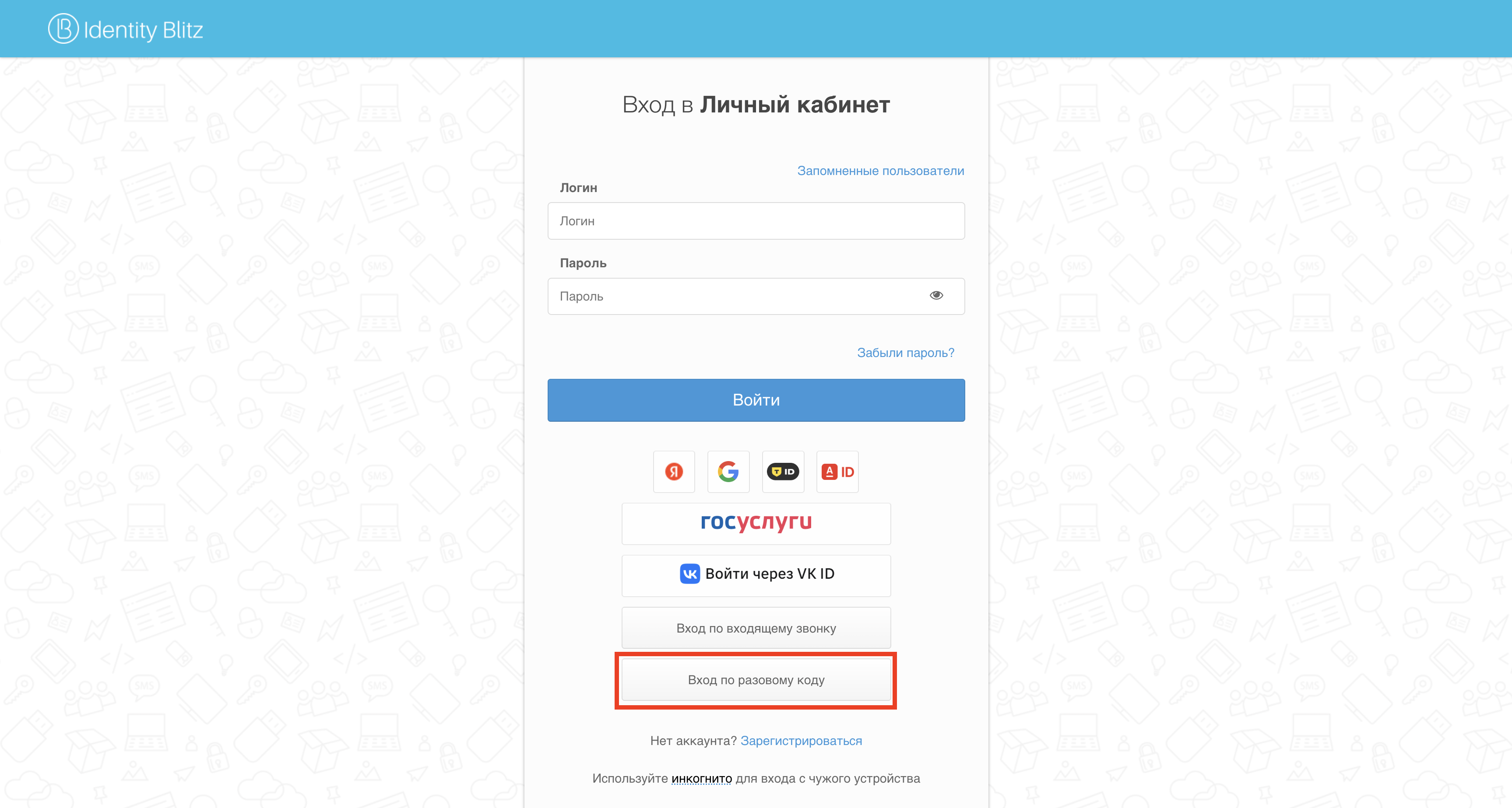 На странице входа выберите Войти по разовому коду. В результате отобразится поле
