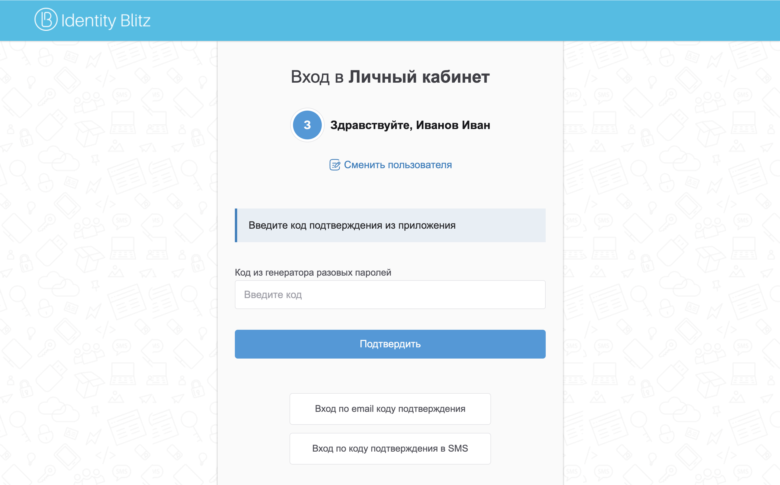В зависимости от настроек Blitz Identity Provider, установленных организацией, помимо входа по логину и паролю, пользователю может быть доступен вход с помощью разового пароля на основе времени (TOTP).