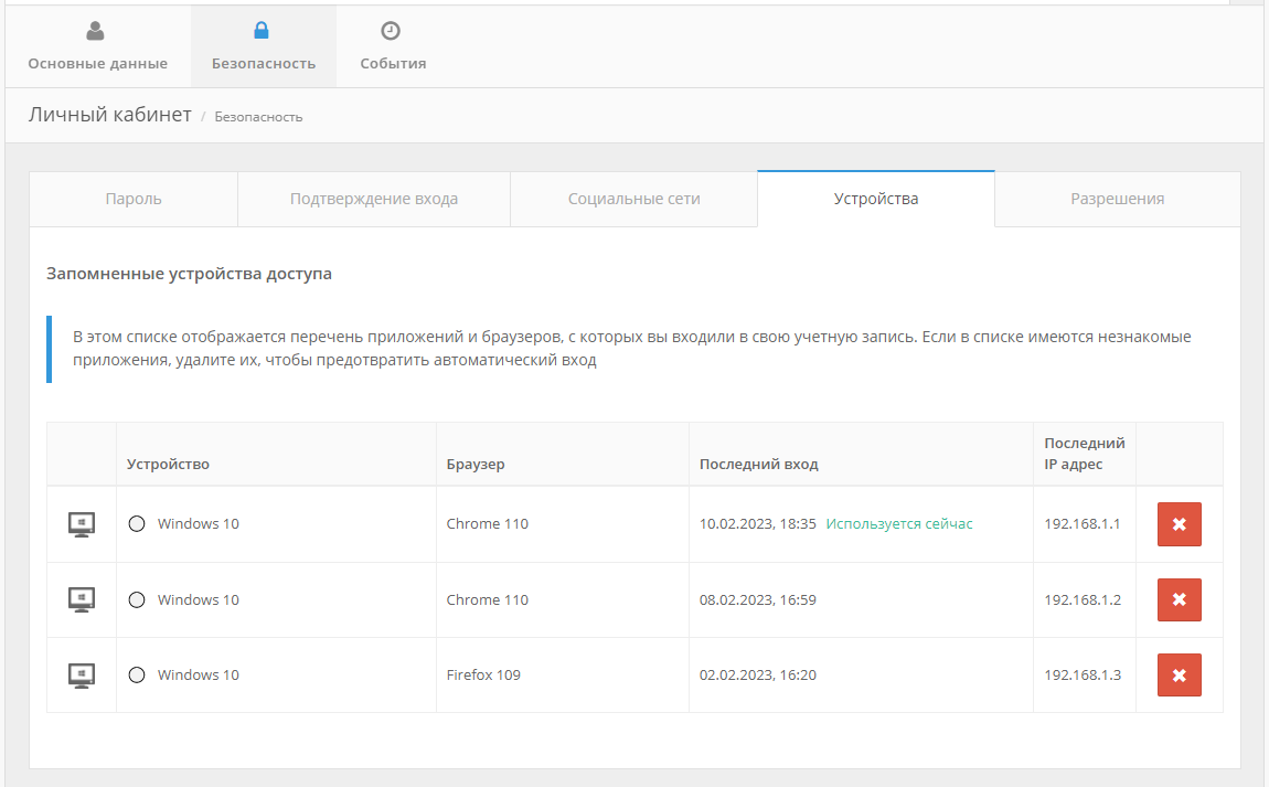 на странице Личного кабинета перейти в раздел «Безопасность» и выбрать вкладку «Устройства»;