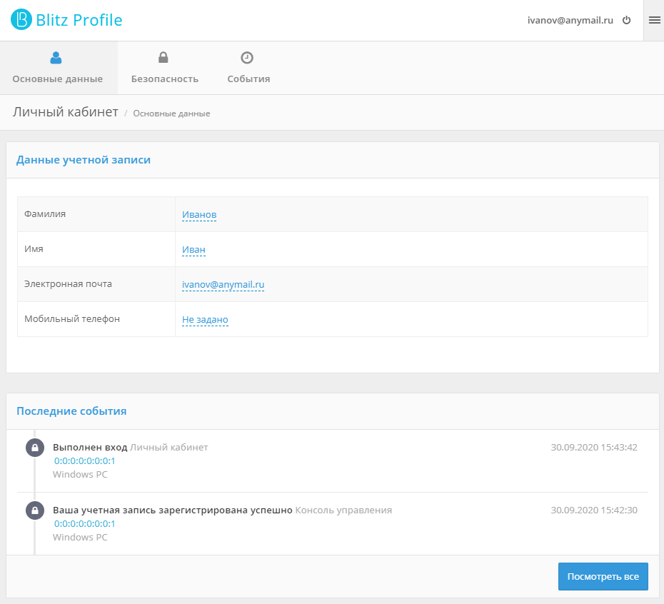 Управление данными учетной записи в системе Blitz Identity Provider